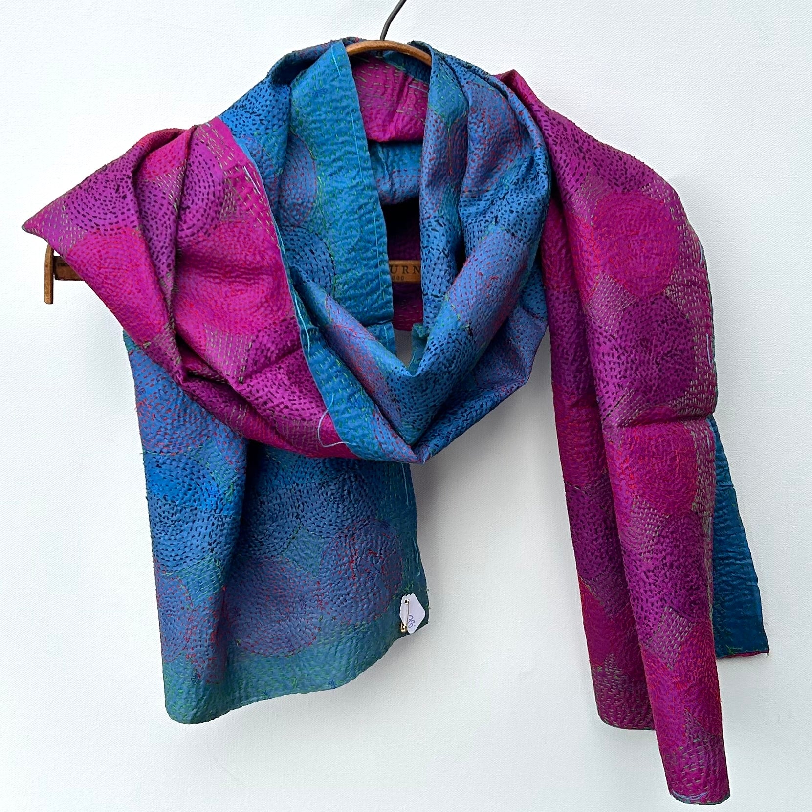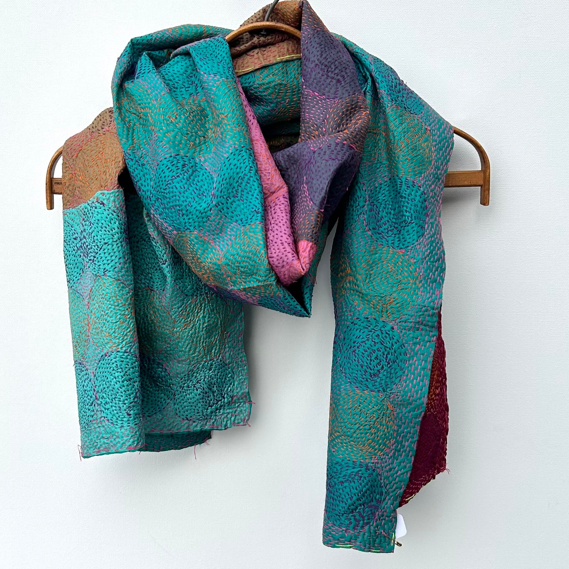 Kantha scarves are lightweight and warm. Made from vintage silk saris, each one is unique.