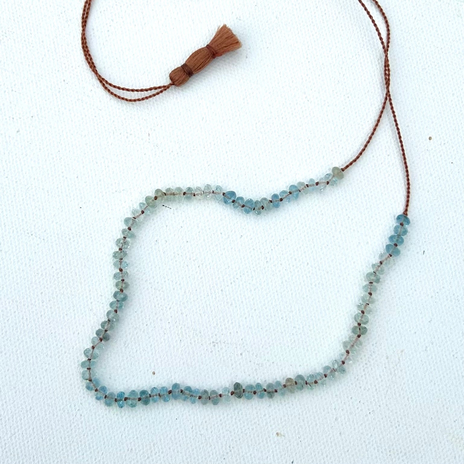 Watery blue aquamarines are knotted on cord, with a sliding bead to adjust the length up to 30” long. Stones span 10.75”.