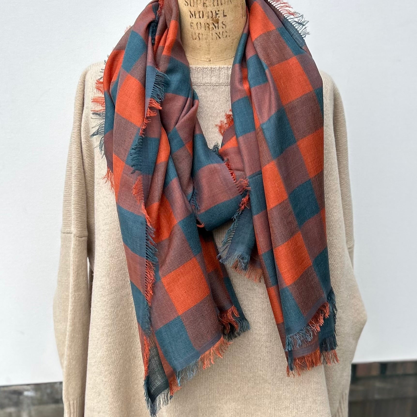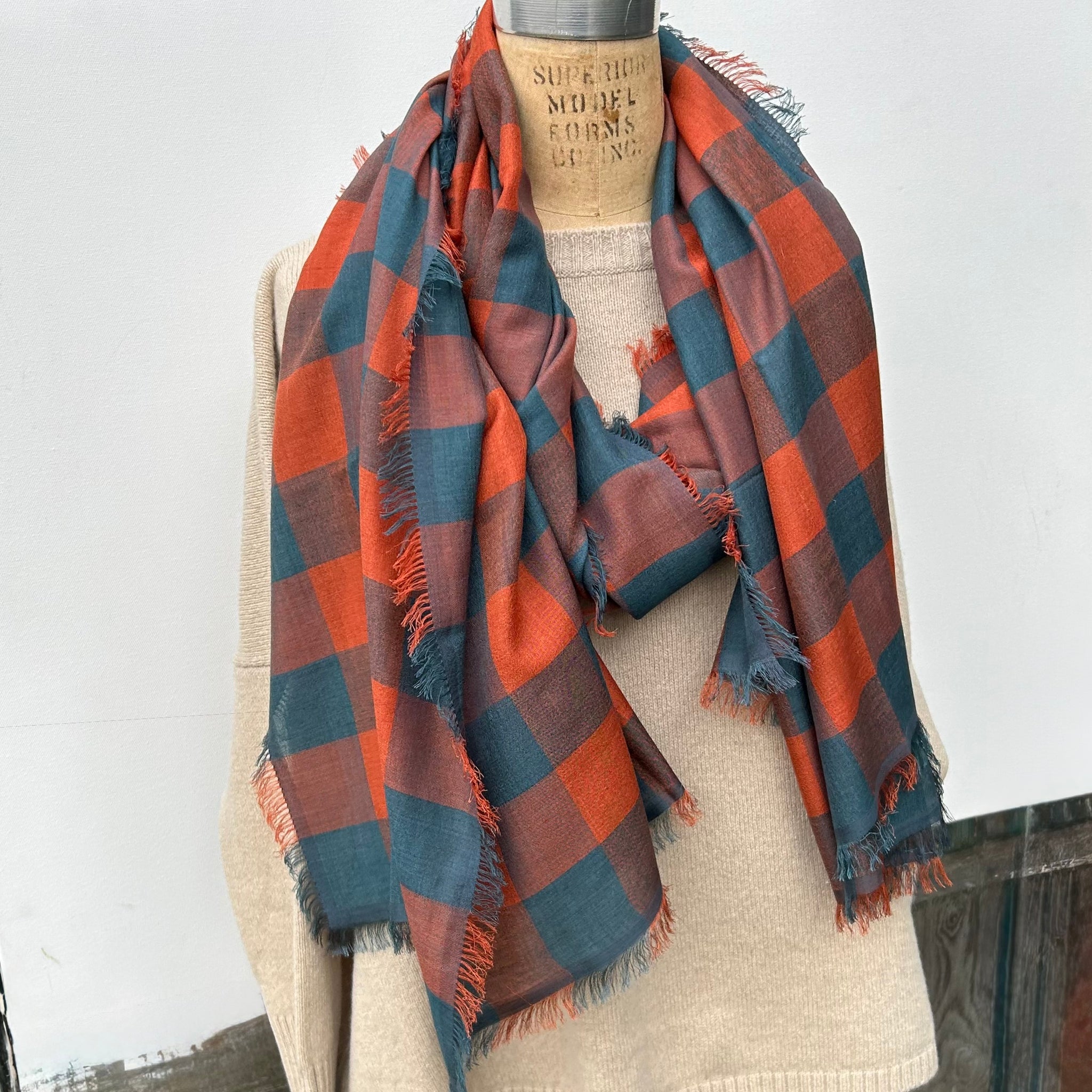 Big beautiful wrap from Susy Pilgrim Waters.  These scarves are 33” by 85”.  Very light blend of silk and wool.