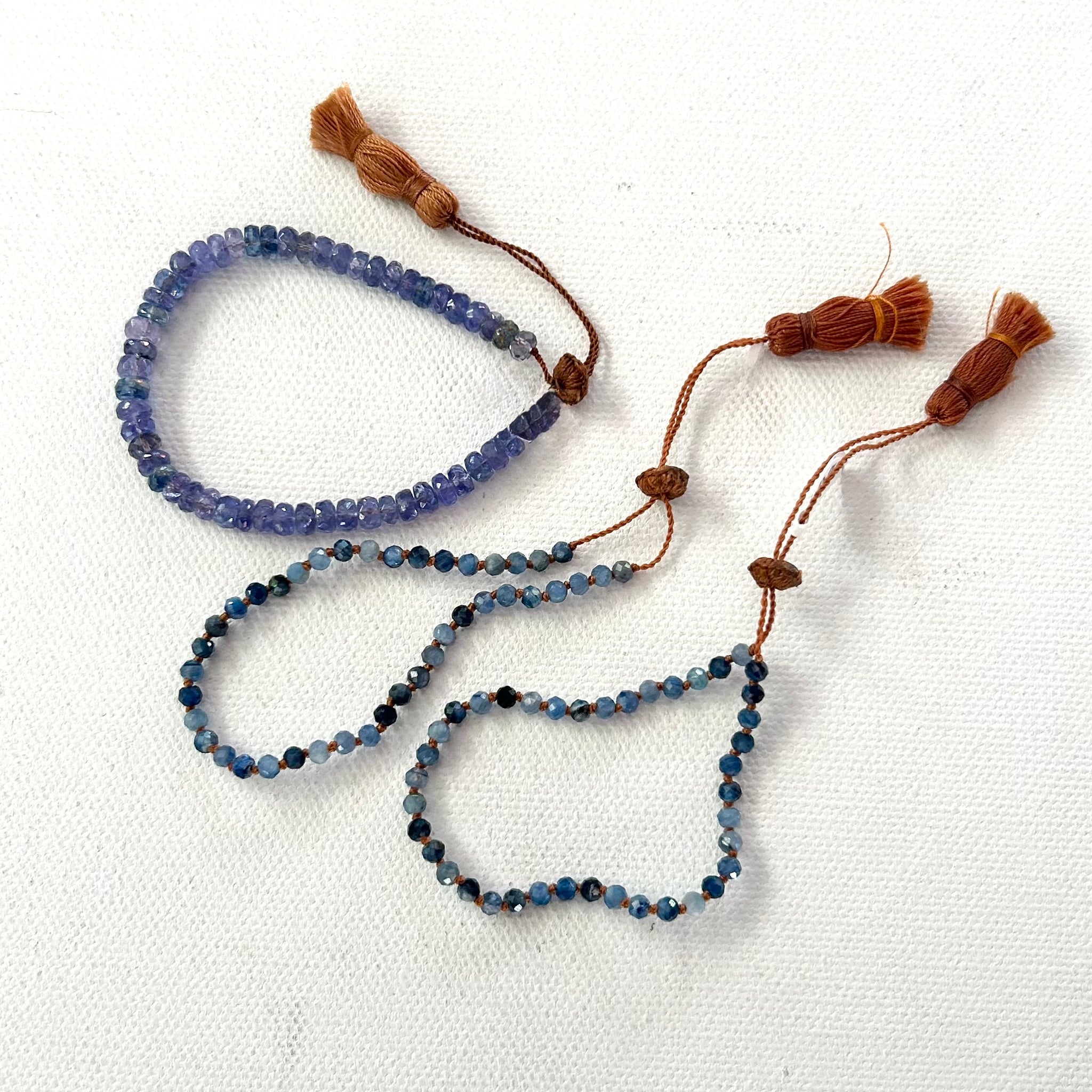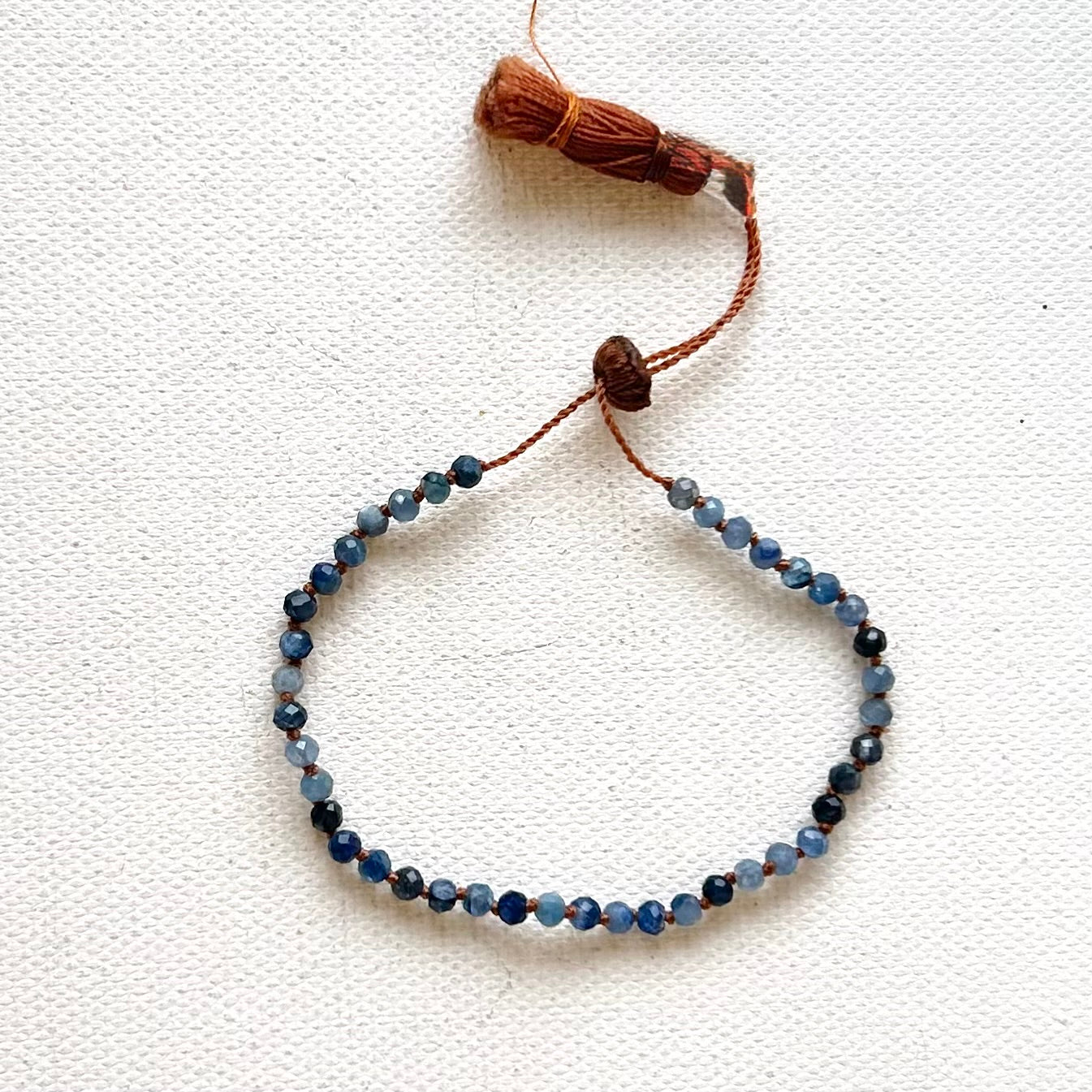 Faceted and intensely blue kyanite stones are strung on an adjustable tan cord, with sliding knot and tassel. These bracelets can accommodate many wrist sizes.