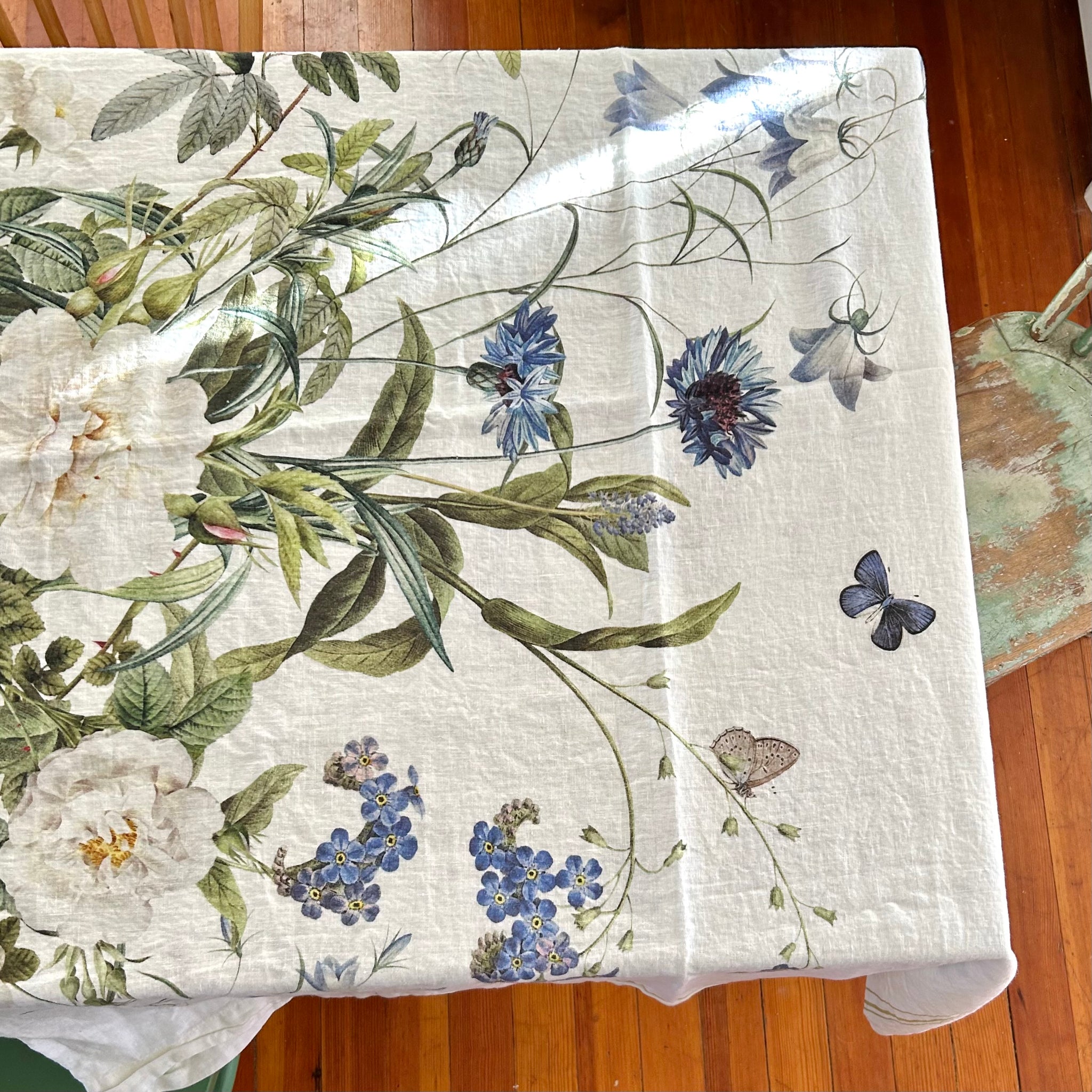 Stone-washed linen tablecloth, designed in Denmark, with a field of blue and white flowers. This cloth is 57" by 86". Bringing the garden inside.