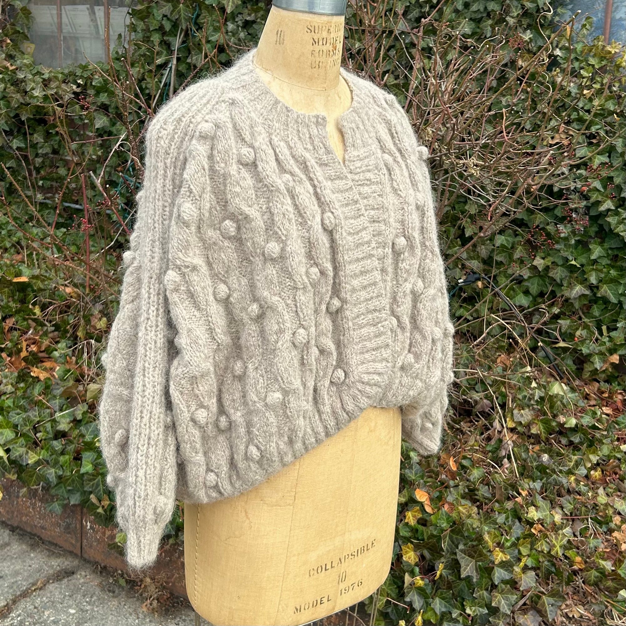 Fluffy and cozy hand knit cardigan is made in Peru.  When laid out flat measures approximately 28” across and is 18-21” long. Happy popcorn knit, yarn is 89% alpaca, 11% polyamide. This one size sweater has wide blouson sleeves, fits sizes 4-12.