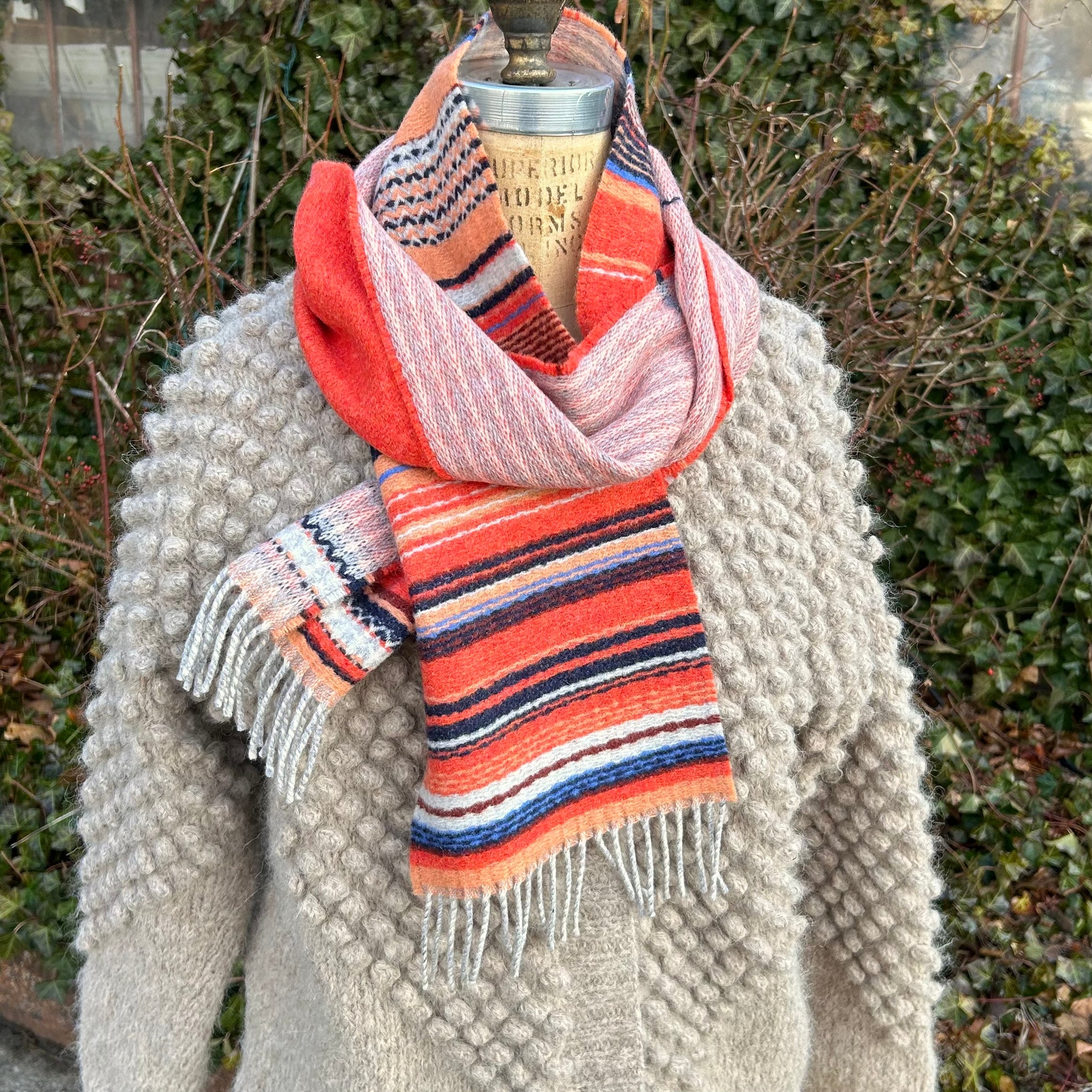A lively pop of color from master weavers Wallace # Sewell. This scarf is soft wool, 70" by 8".