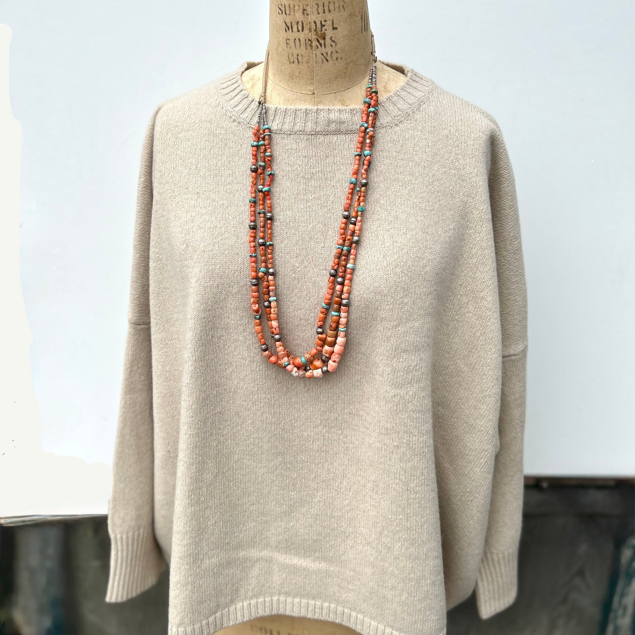Native American three strand vintage coral necklace with turquoise and silver is 32" long. This necklace has no clasp, simple wrapped cord at the back of the neck. Bold in size, but subtle in color, this is a beautiful piece.