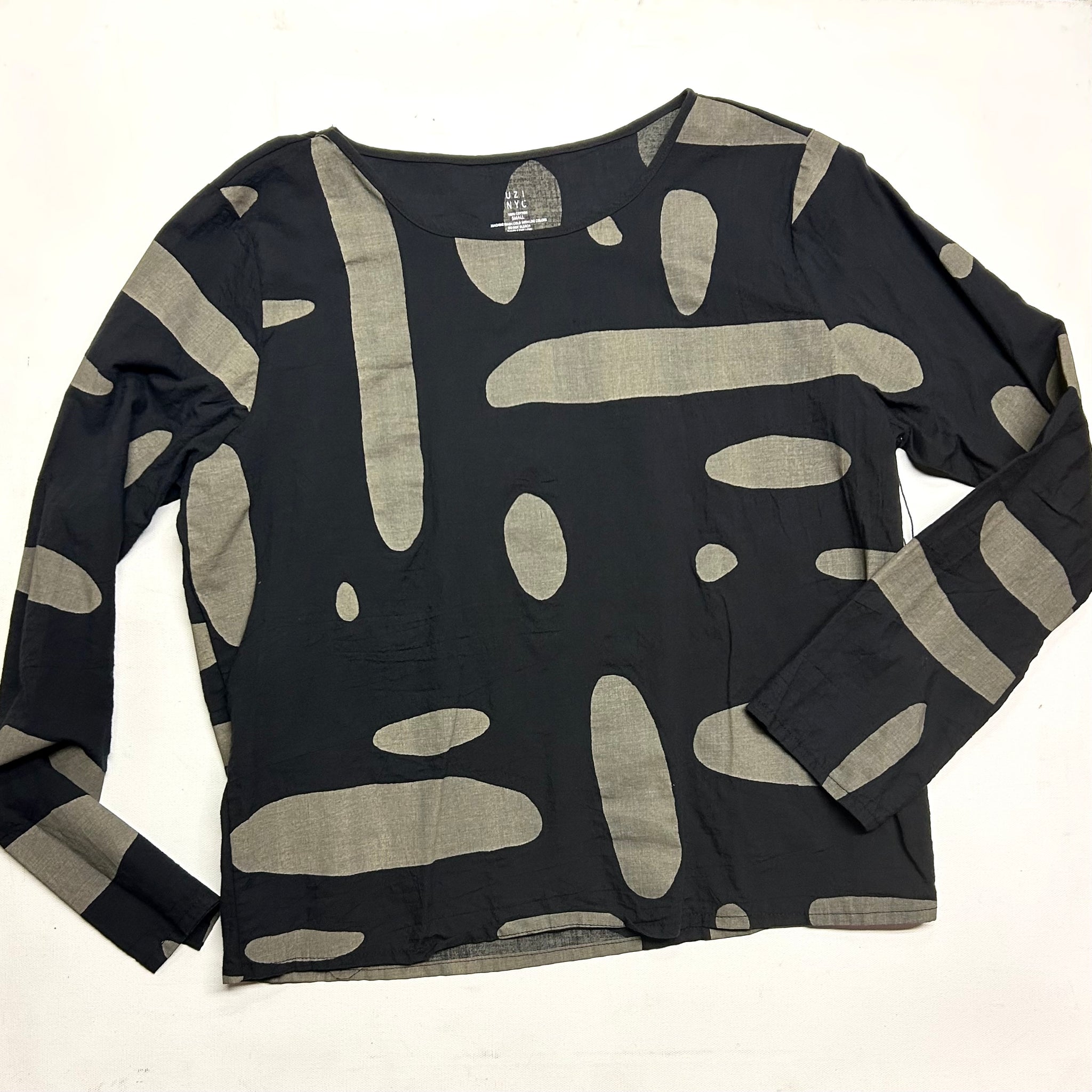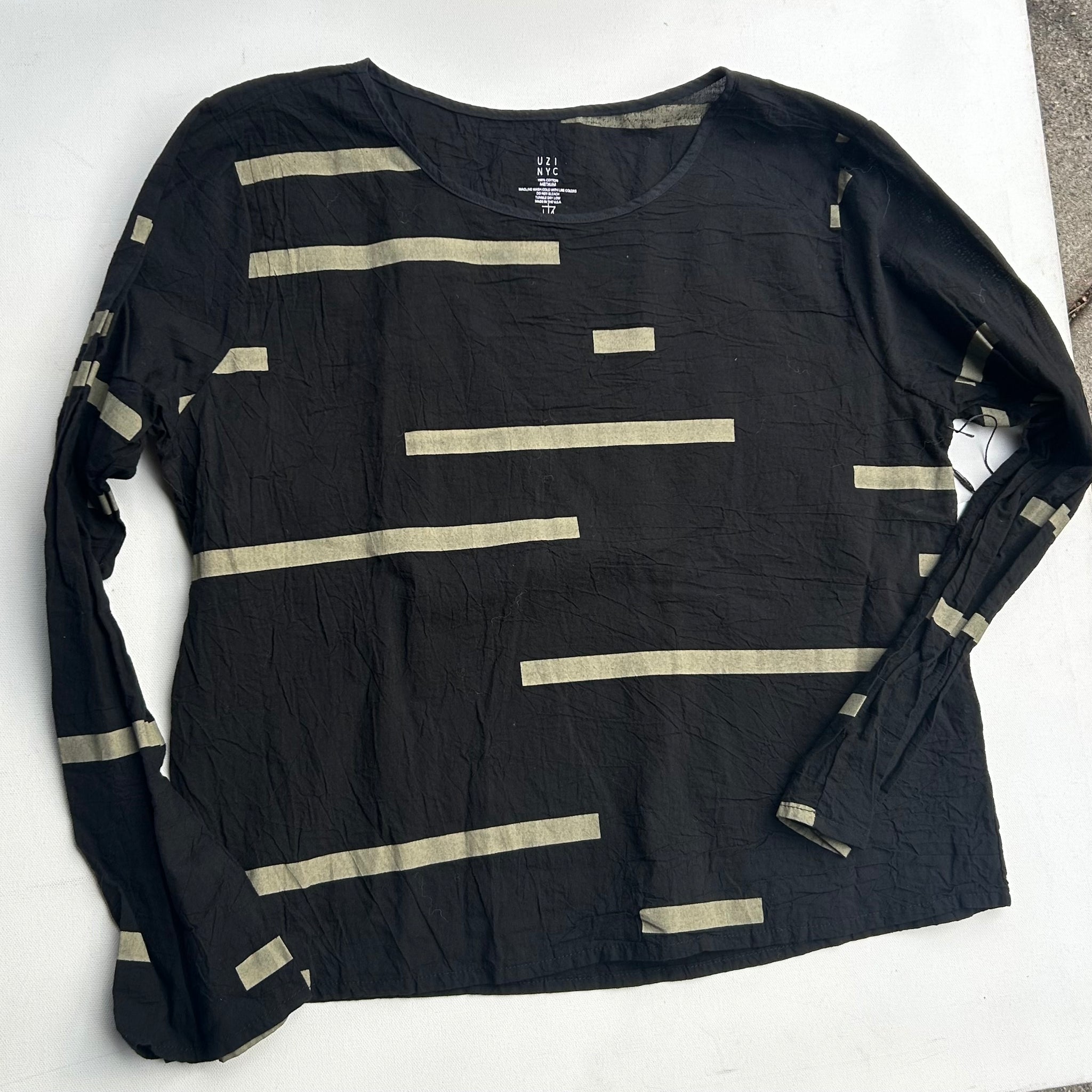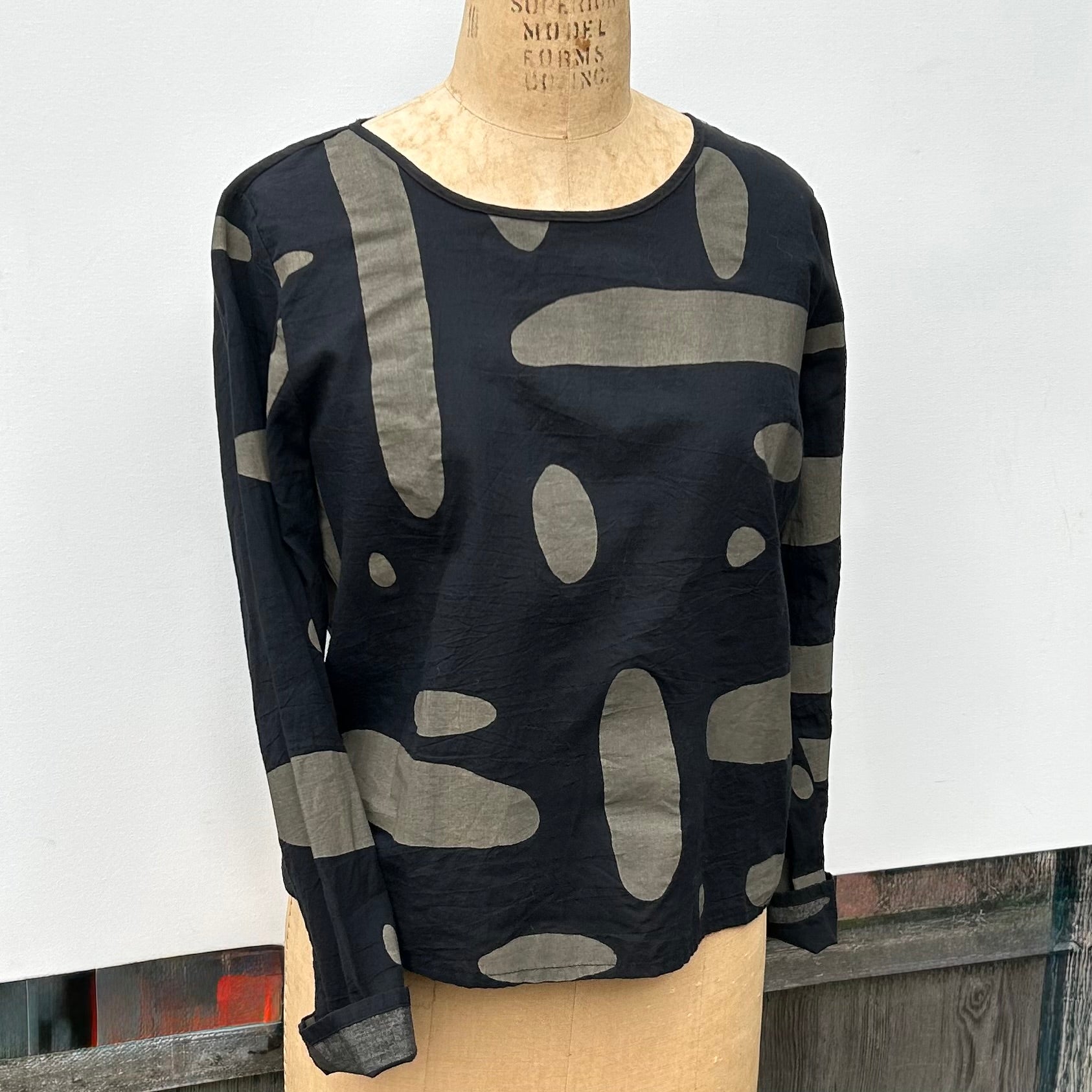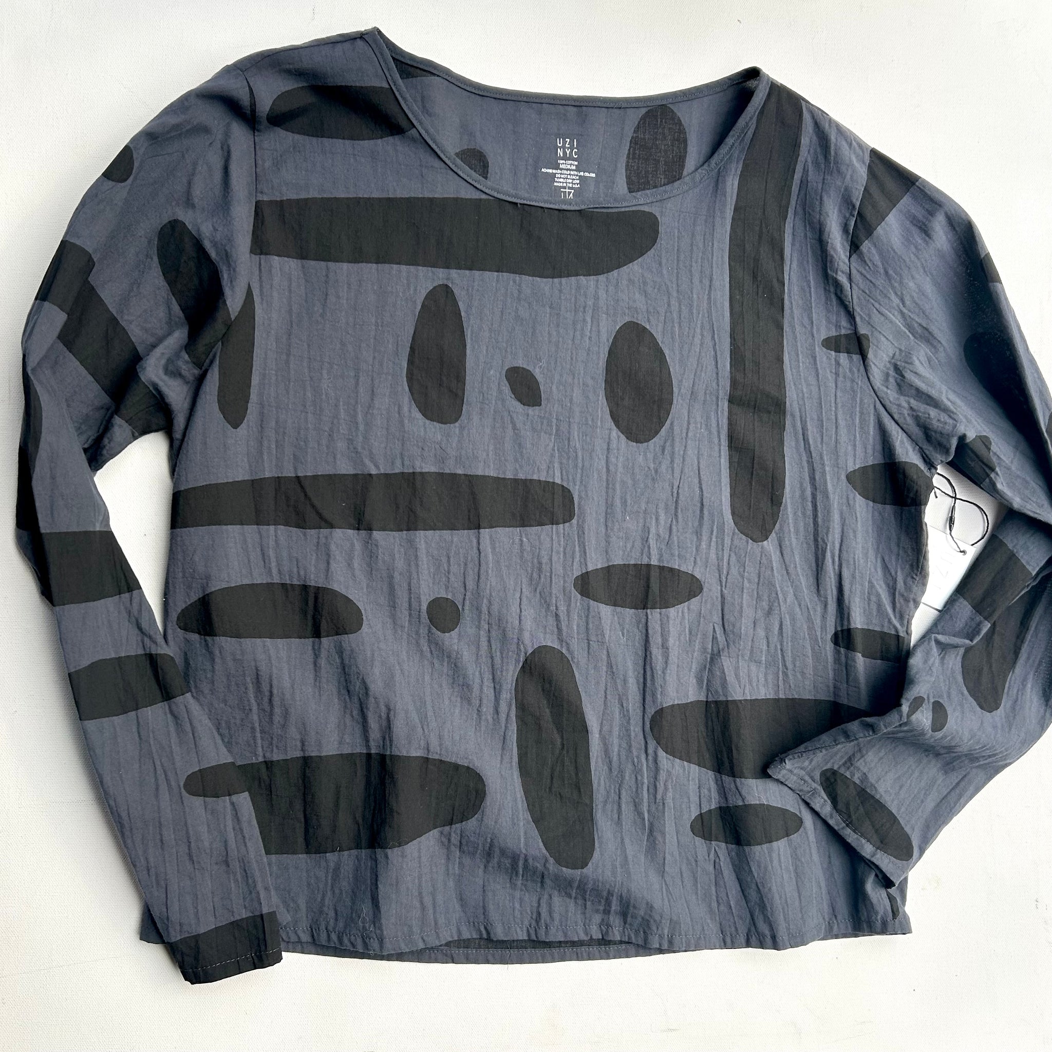 Slightly crinkly cotton lawn top is straight fitting, and below the waist length.  Made in the U.S.