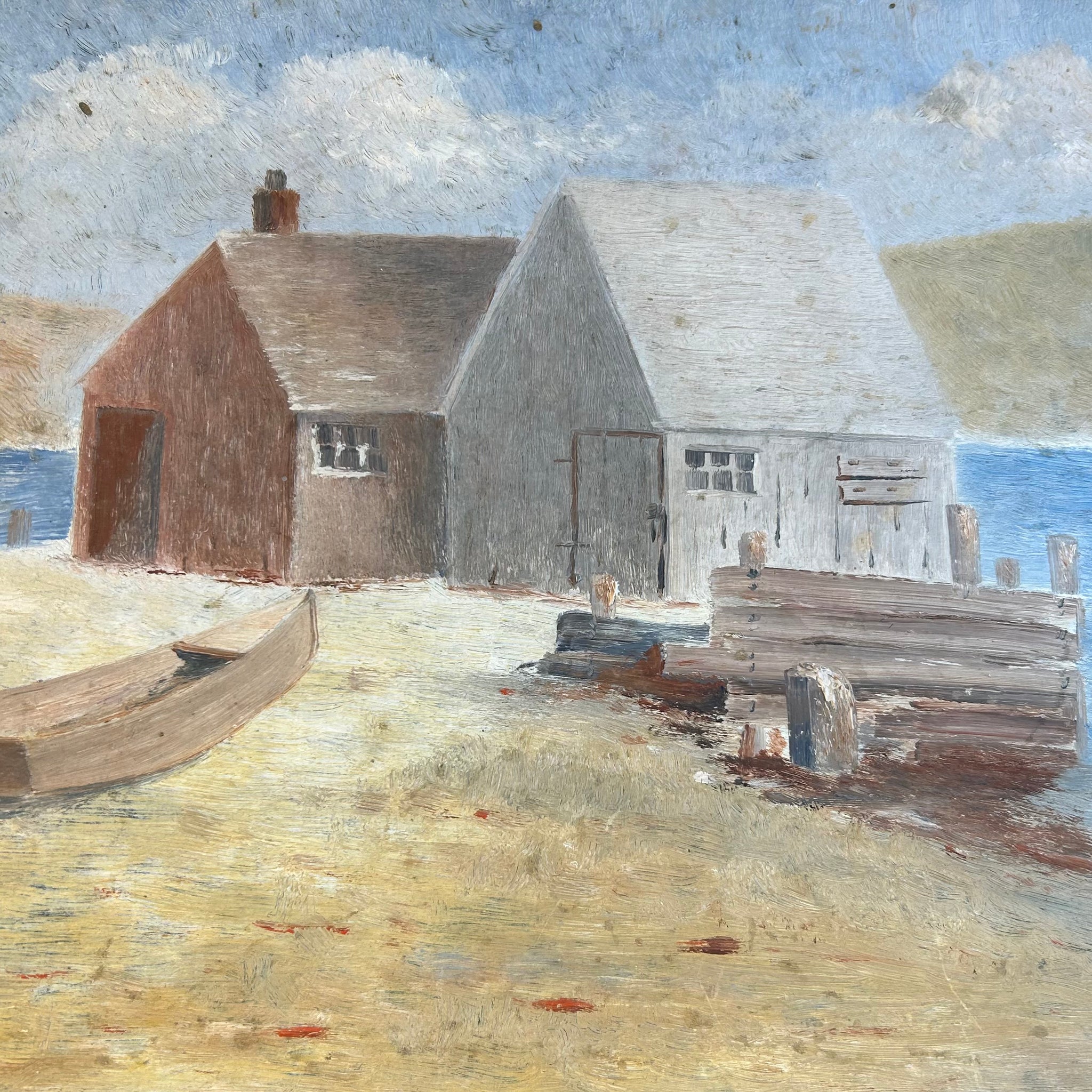 Charming and primitive fishing shack painting on board. Including frame this is approximately 12" by 17.5". Not signed or dated.