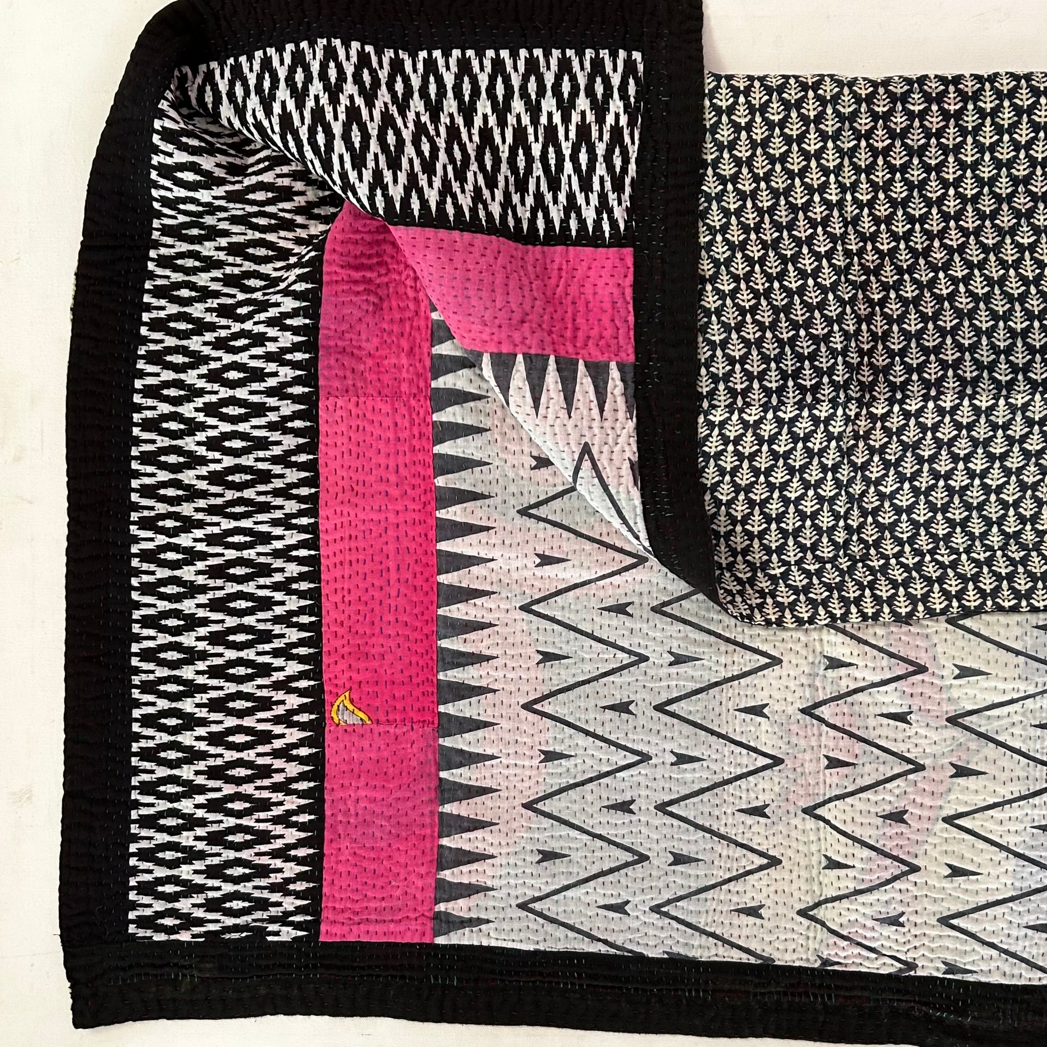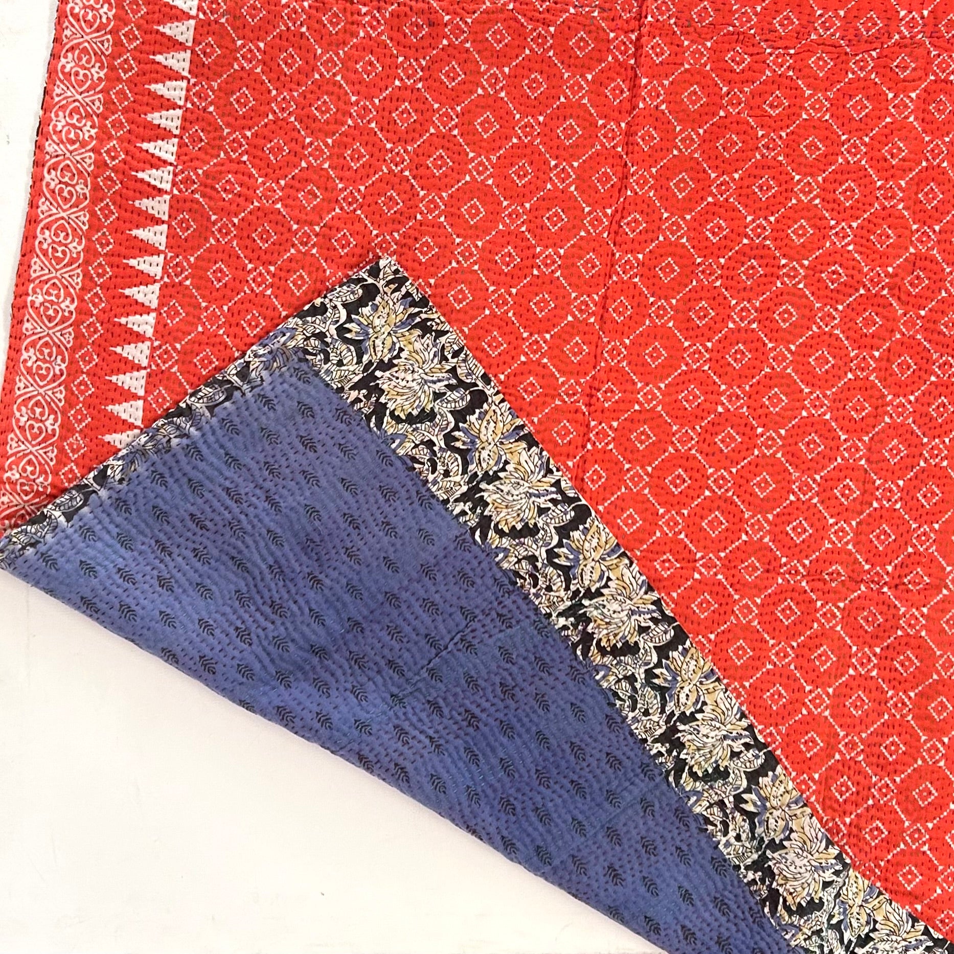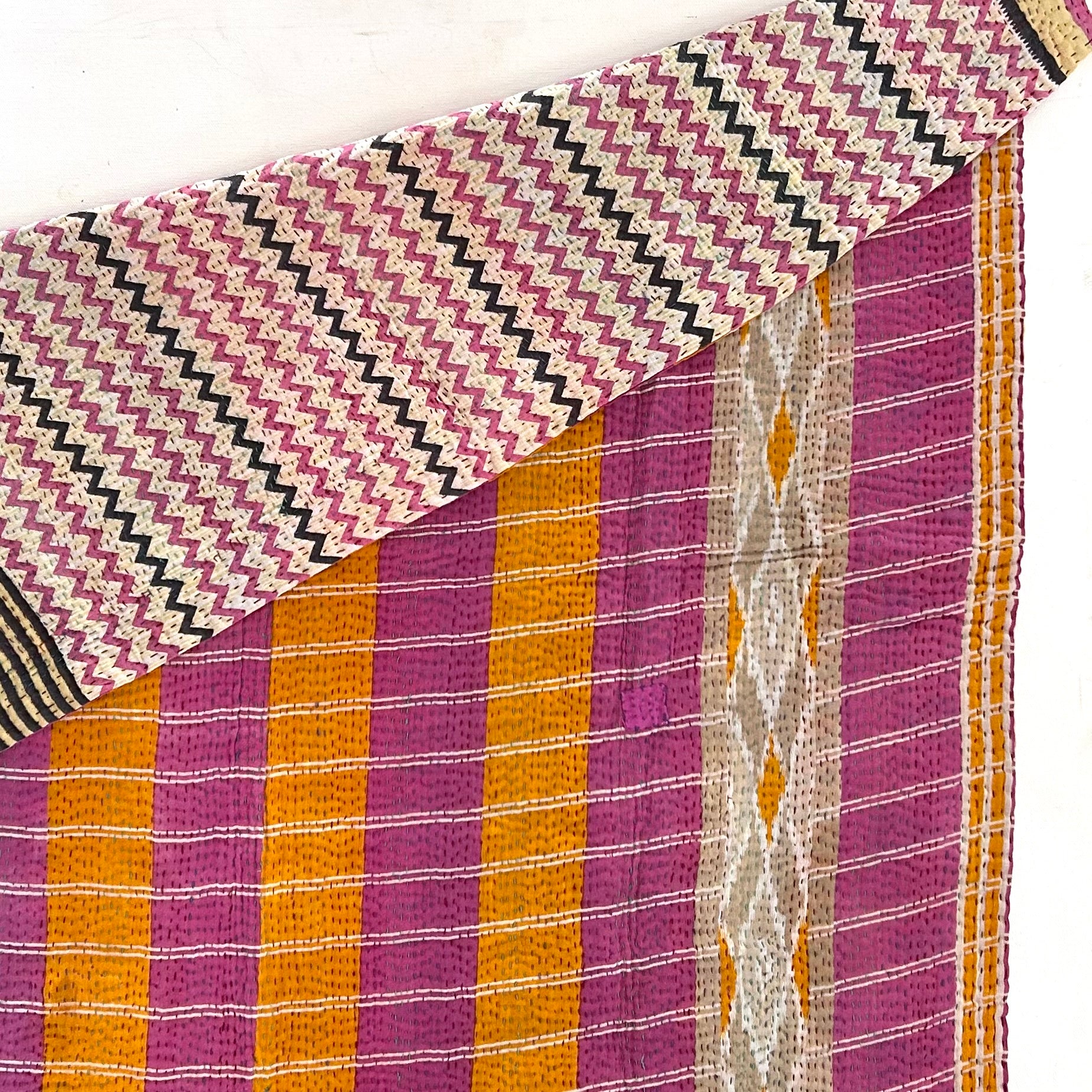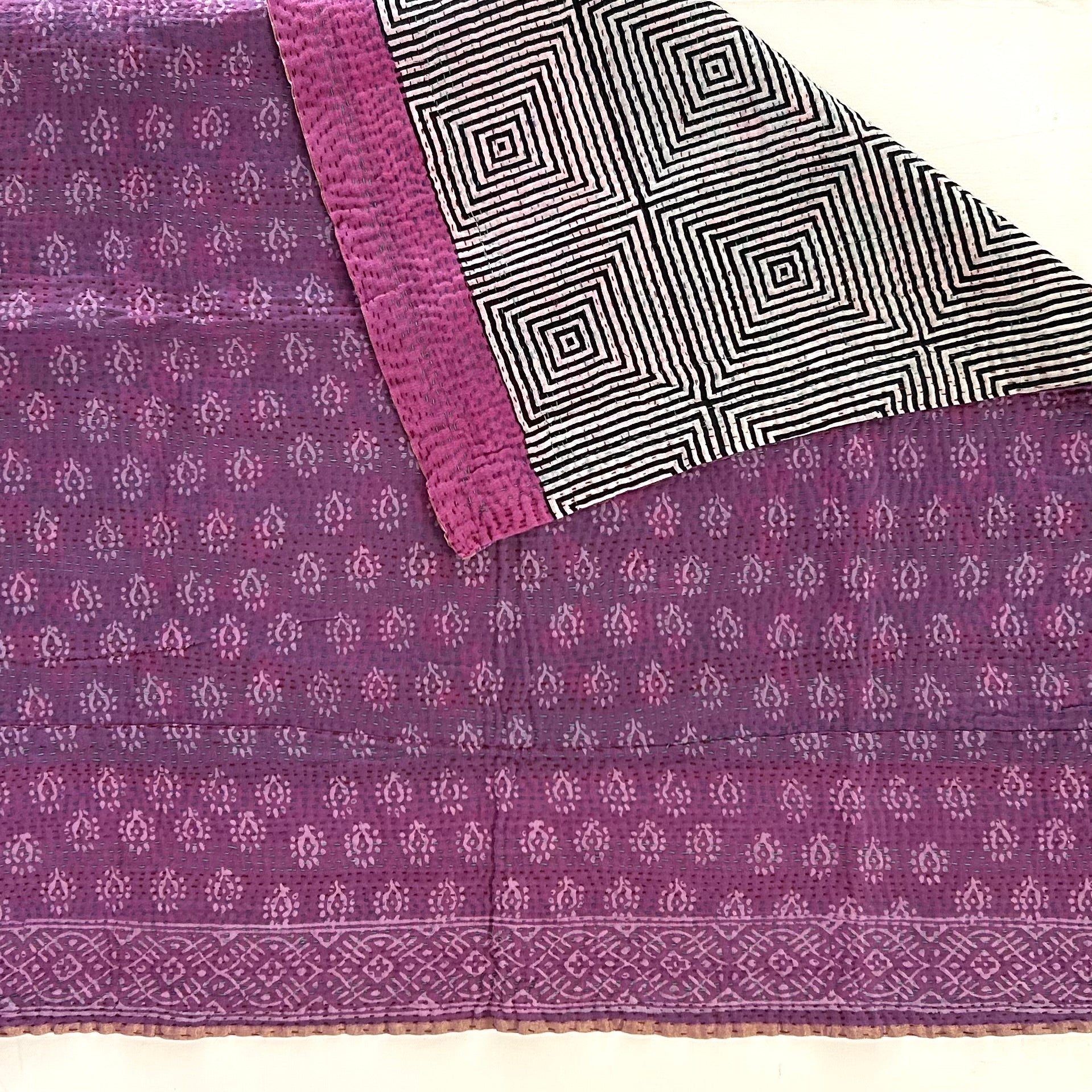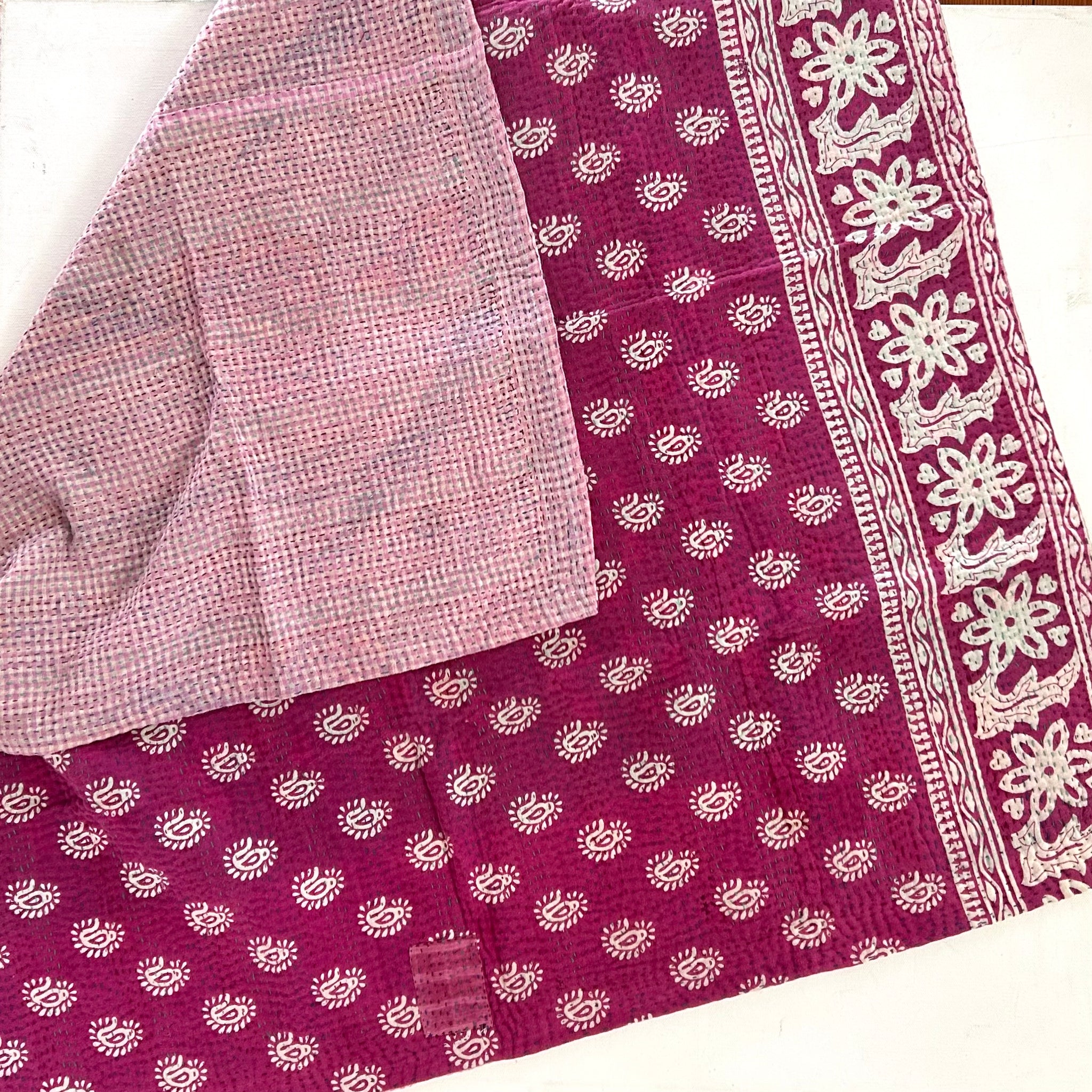 Layers and layers of vintage cotton sari cloth, hand stitched together to make these soft, light, and warm quilts. Quilts measure approximately 38” by 42”.