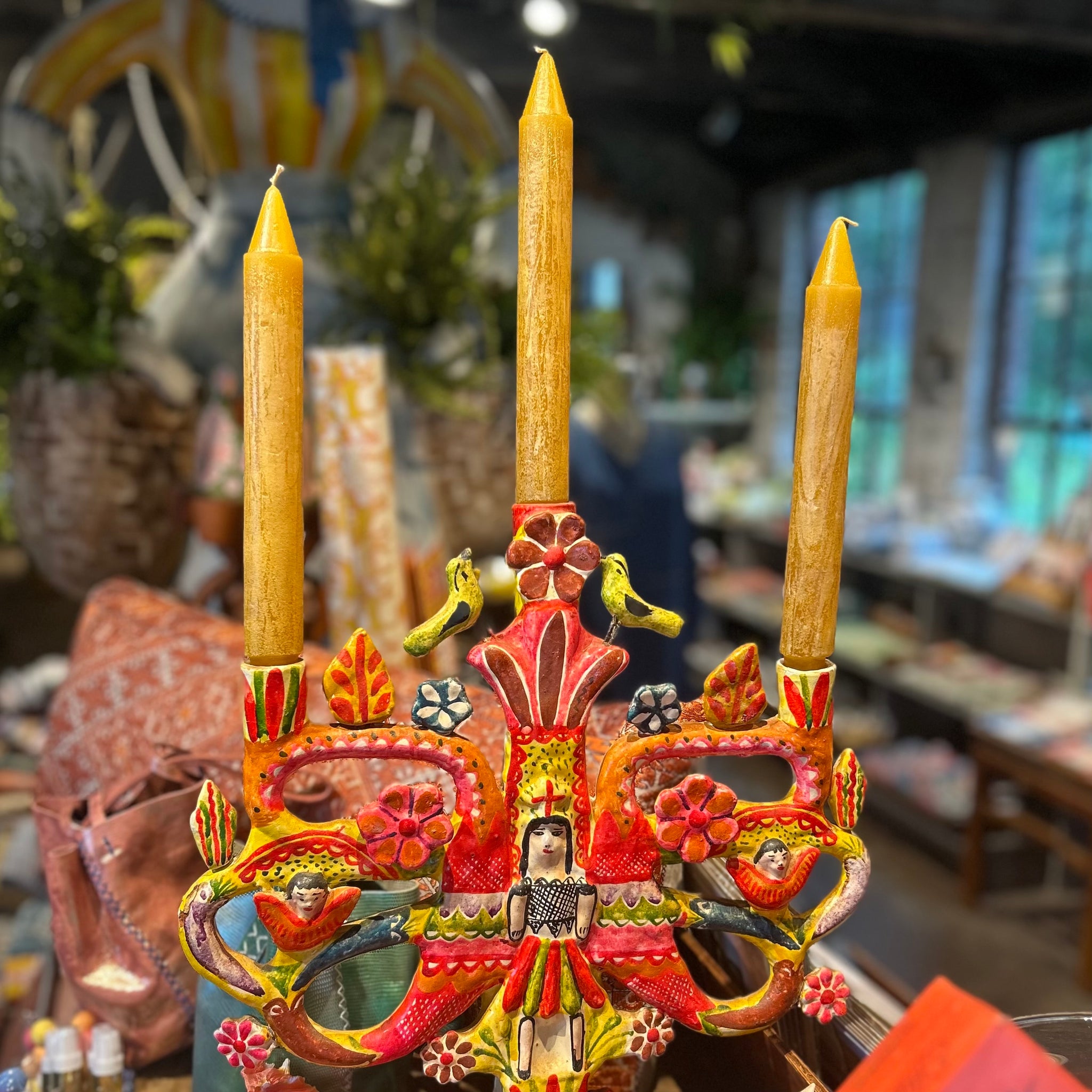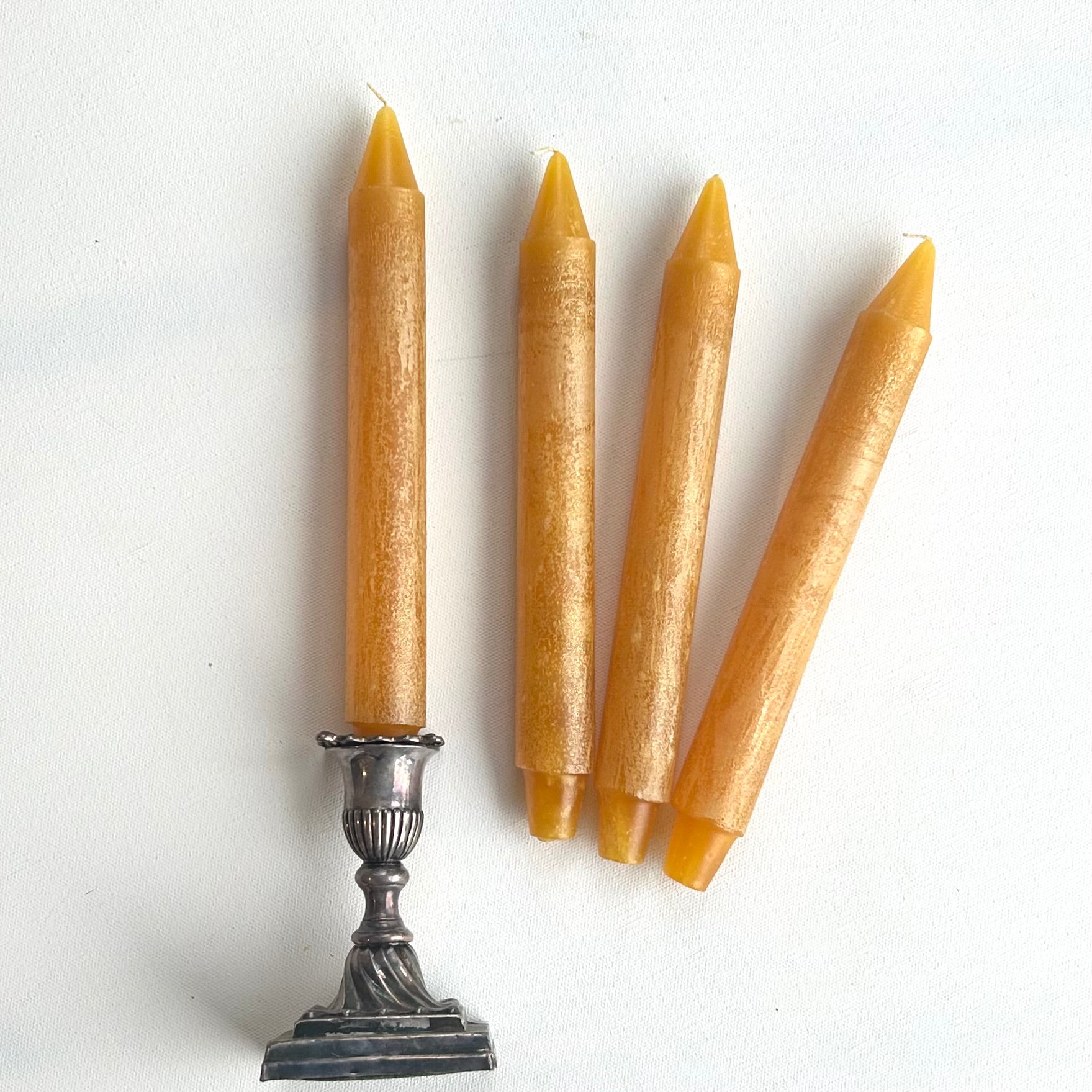 Set of four mildly metallic taper candles. These are 10" by 1.25" with a peg bottom.